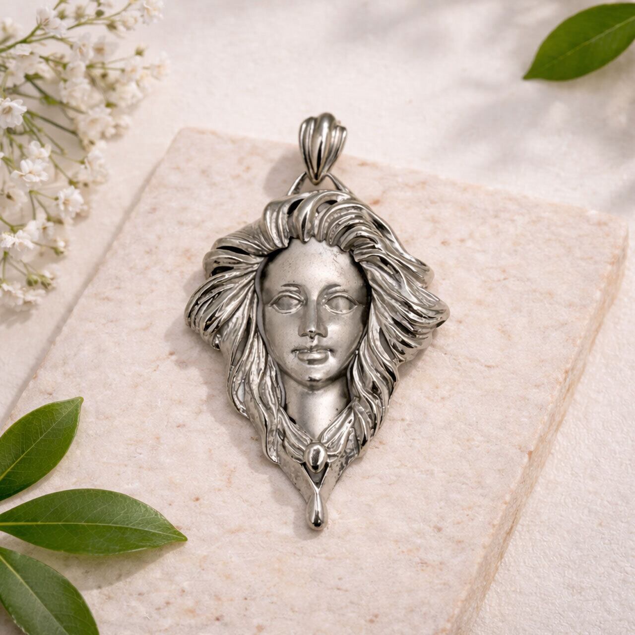 ・柳澤商会ヴィンテージコレクションの整理中に見つかった、シルバーペンダントトップ。気品あふれる女性の正面の表情が印象的で、クラシカルな美しさを感じさせる一品です