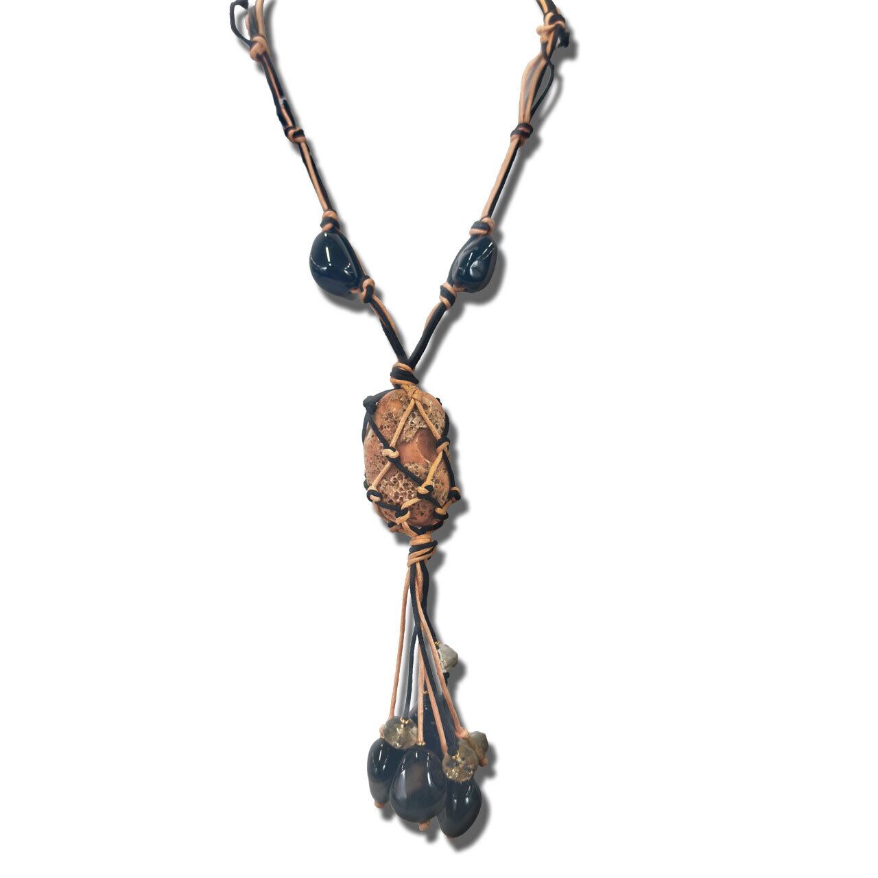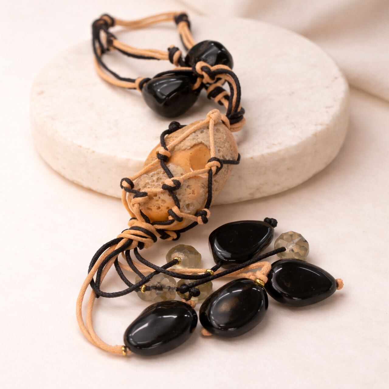 ・丁寧に編み込まれたコードと異なる表情を持つ天然石が美しく調和し、まるで海の記憶を閉じ込めたかのような神秘的な世界観を演出します