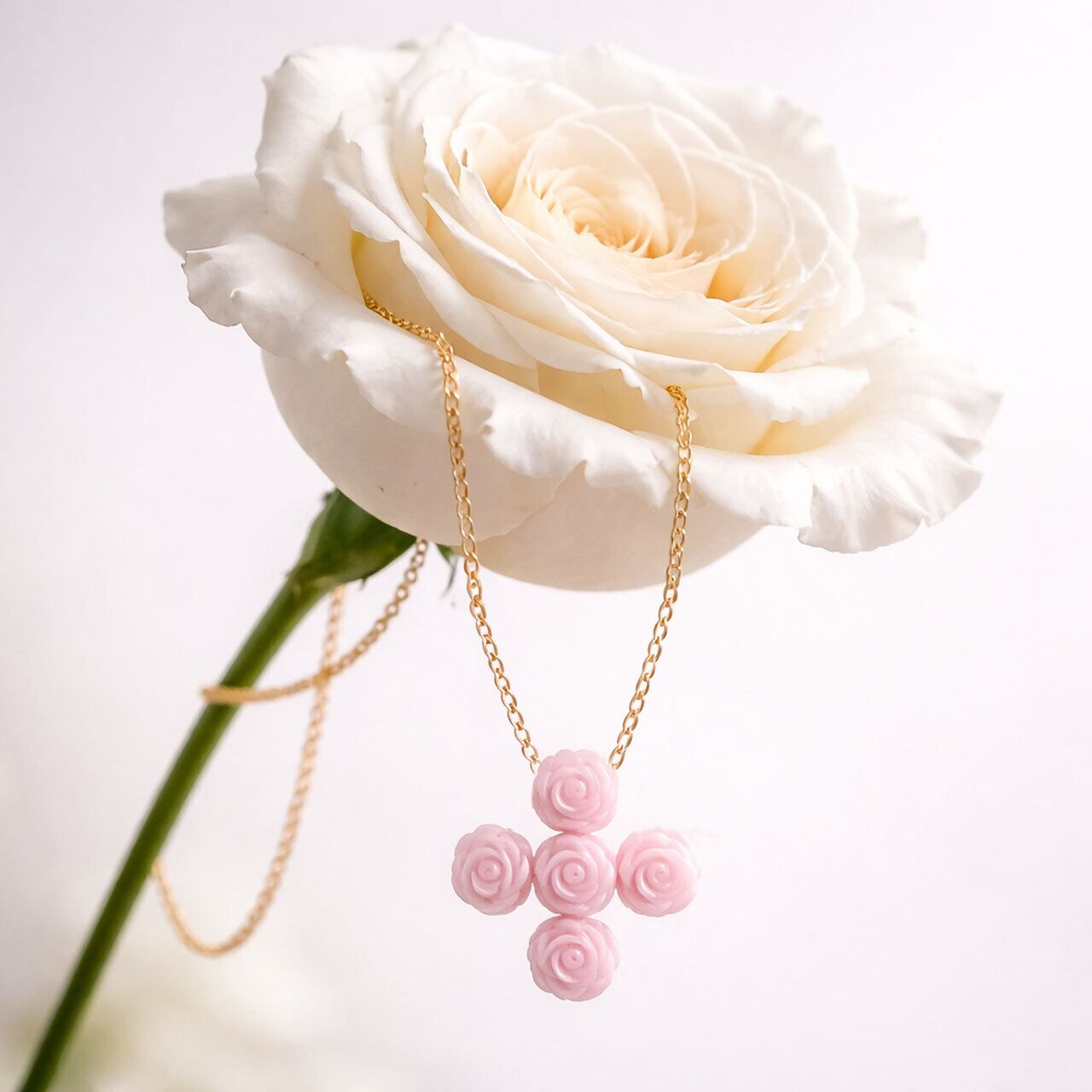 ・やわらかなピンクのローズが優しく咲き誇るペンダントトップ。繊細に表現された小さなバラたちは、光を受けるたびにほのかな陰影を生み出し、静かな存在感と上品な華やかさを纏います
