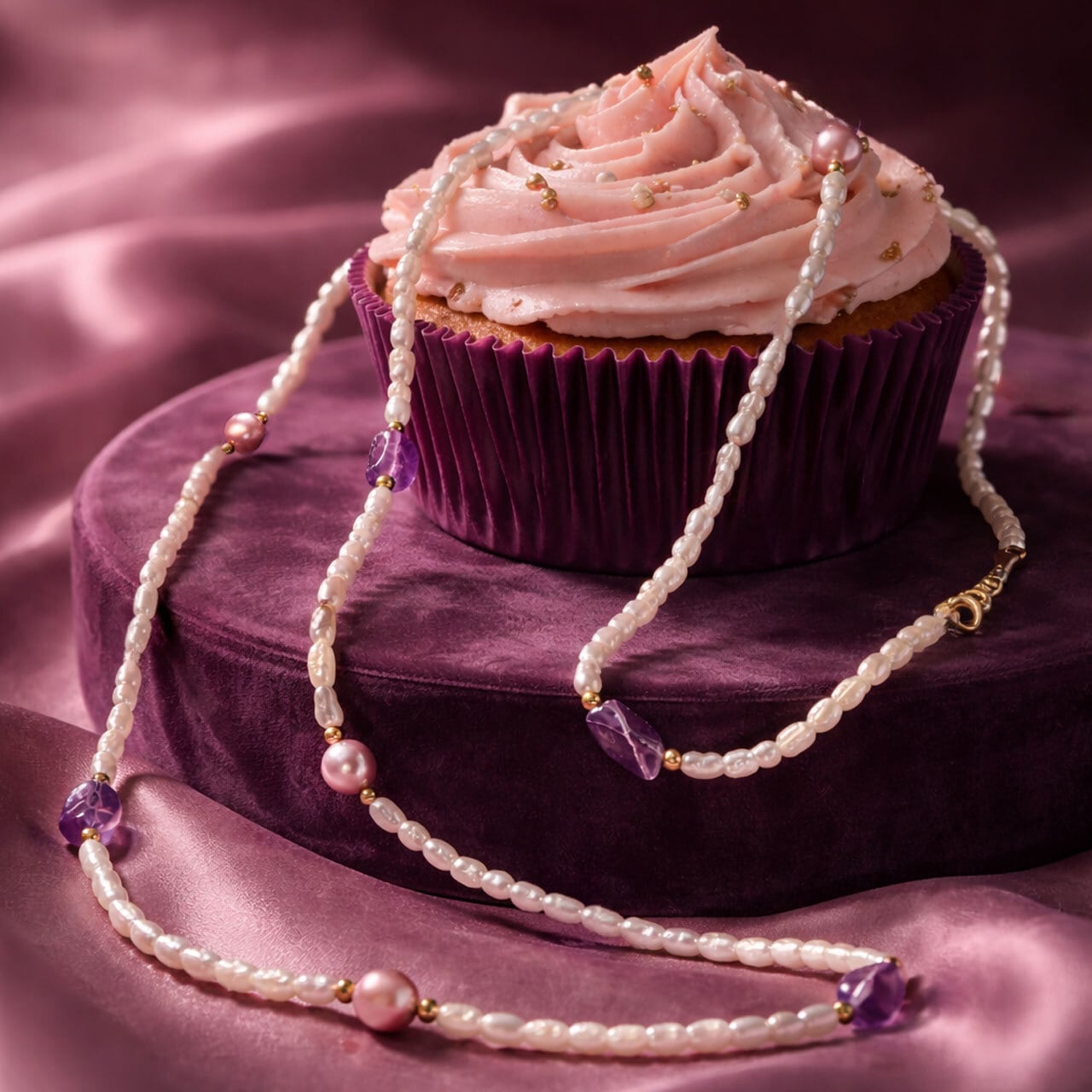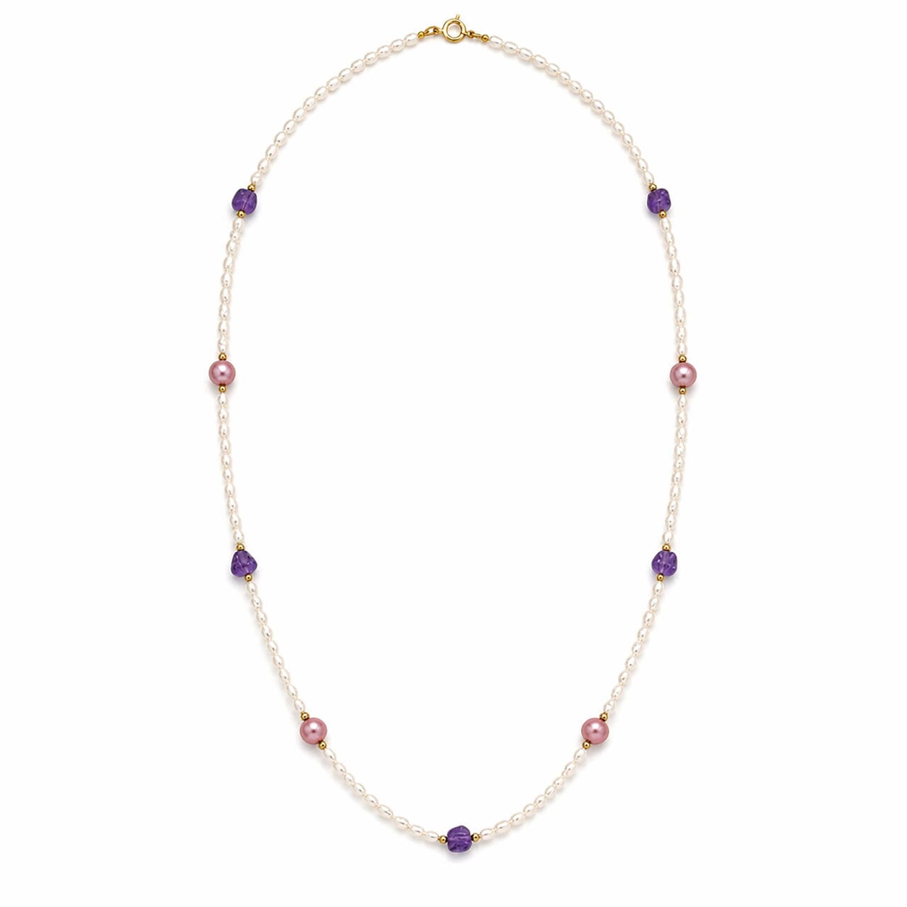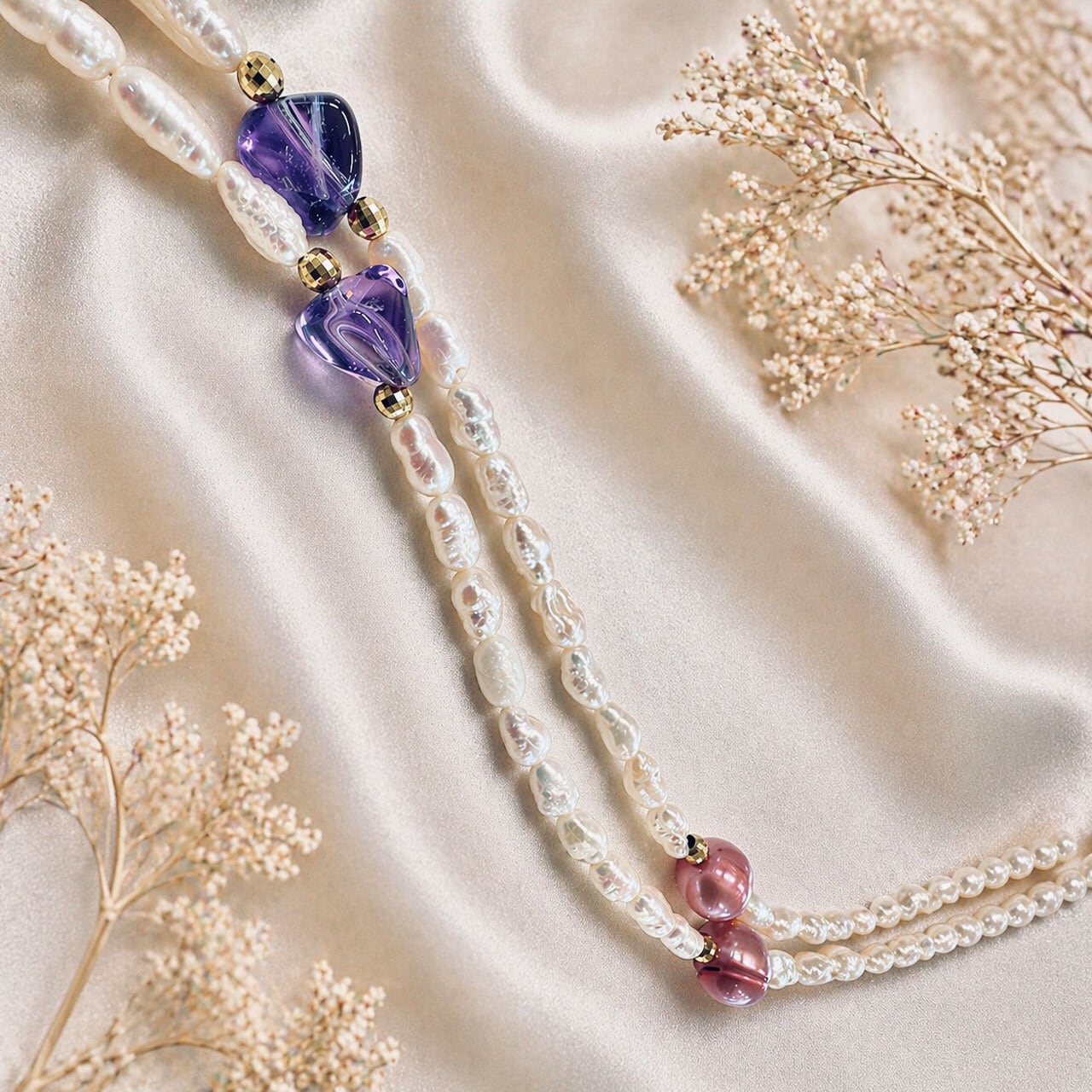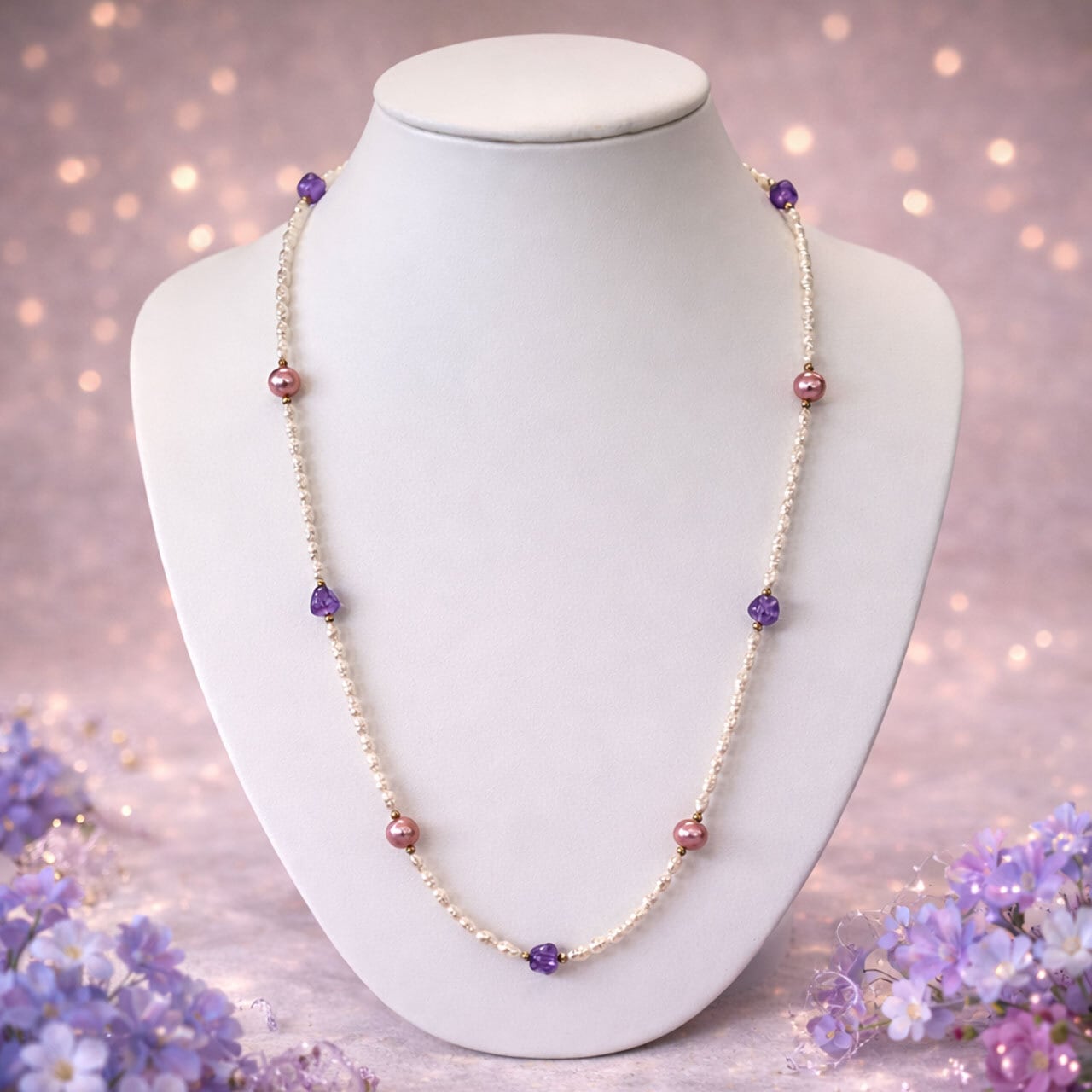・優しく光をまとった小粒のパールに、神秘的にきらめくアメシストと、ほのかに色づくピンクパールを添えたロングネックレス