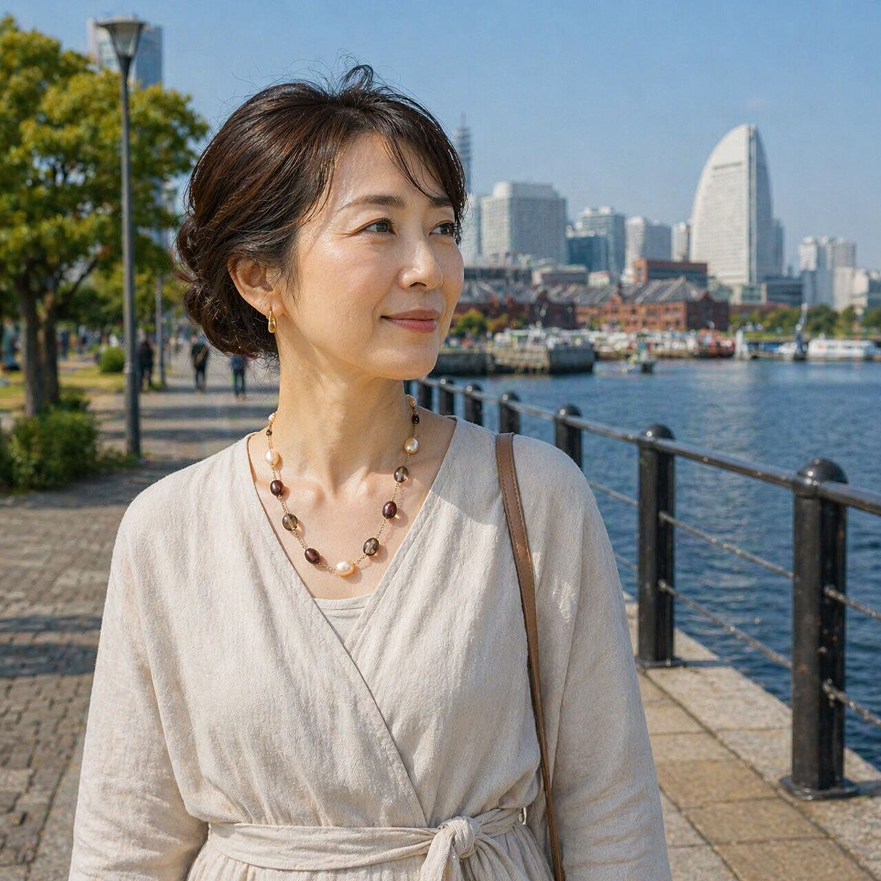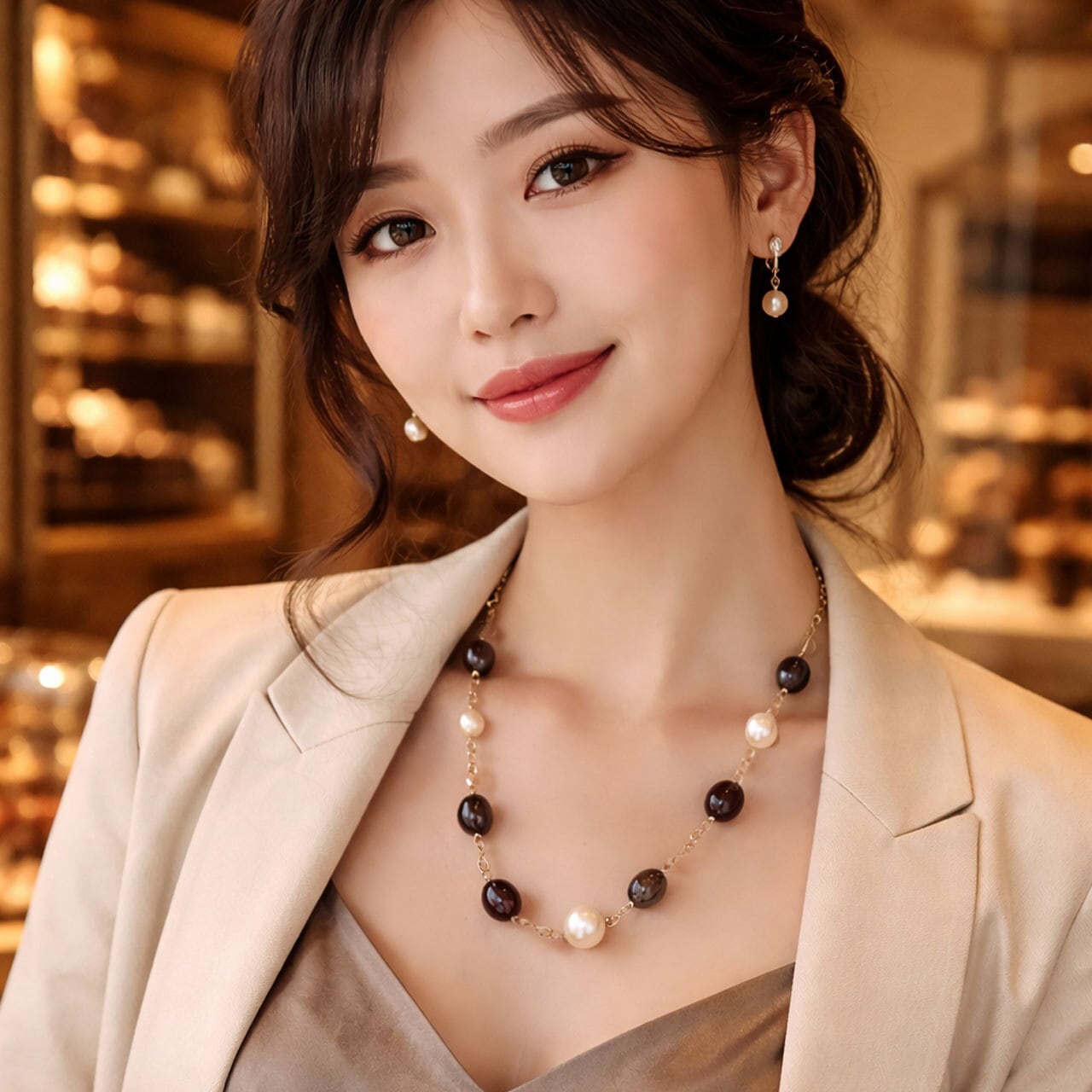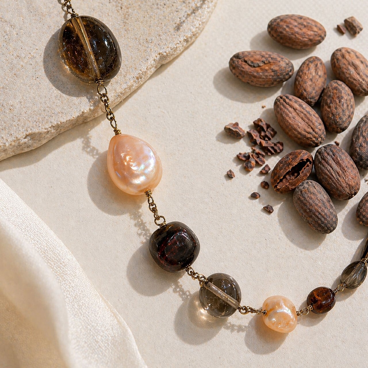・やわらかな光をたたえたニュアンスカラーの淡水パールと、濃いブラウンのスモーキークオーツが、ゆるやかなリズムで連なり、時間の流れまでも穏やかにしてくれるかのよう。その色彩はどこか懐かしく、心をほどくようなやさしさを感じさせます