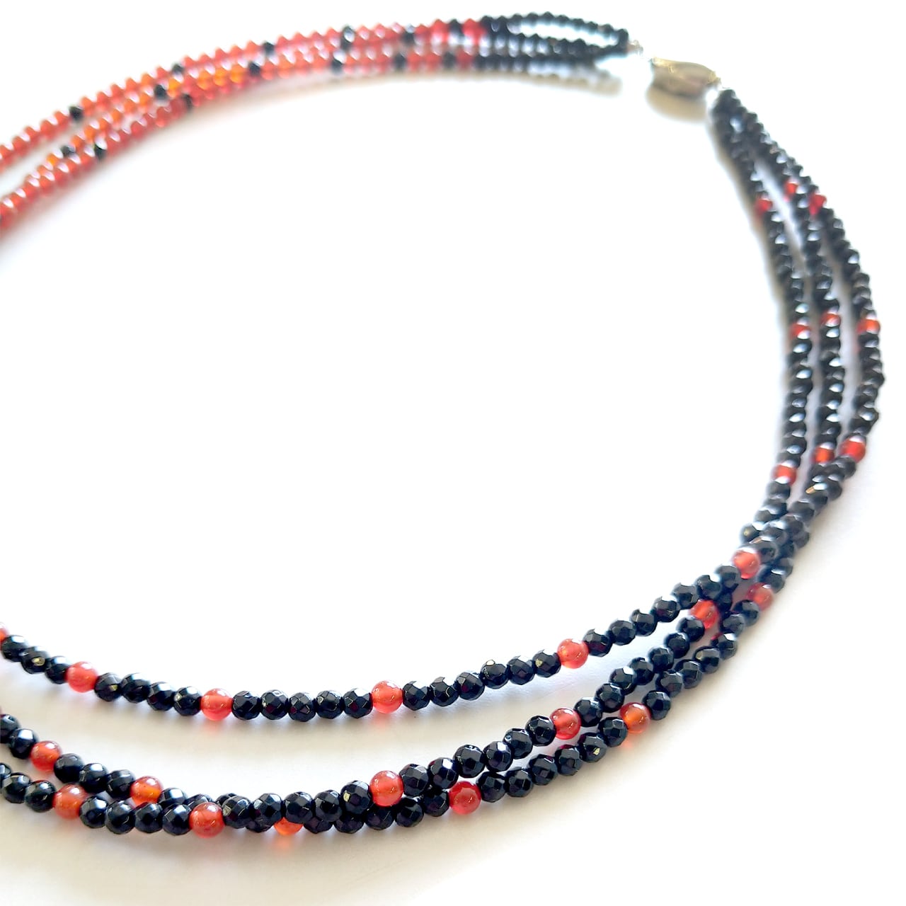 ごく小さな赤い瑪瑙と黒いオニキス。反対色の2種類の宝石をカラーグラデーションに見えるよう少しづつ交互に通しています。シンプルなデザインですが、自然なグラデーションに見えるのが、実はとっても難しいデザインです!