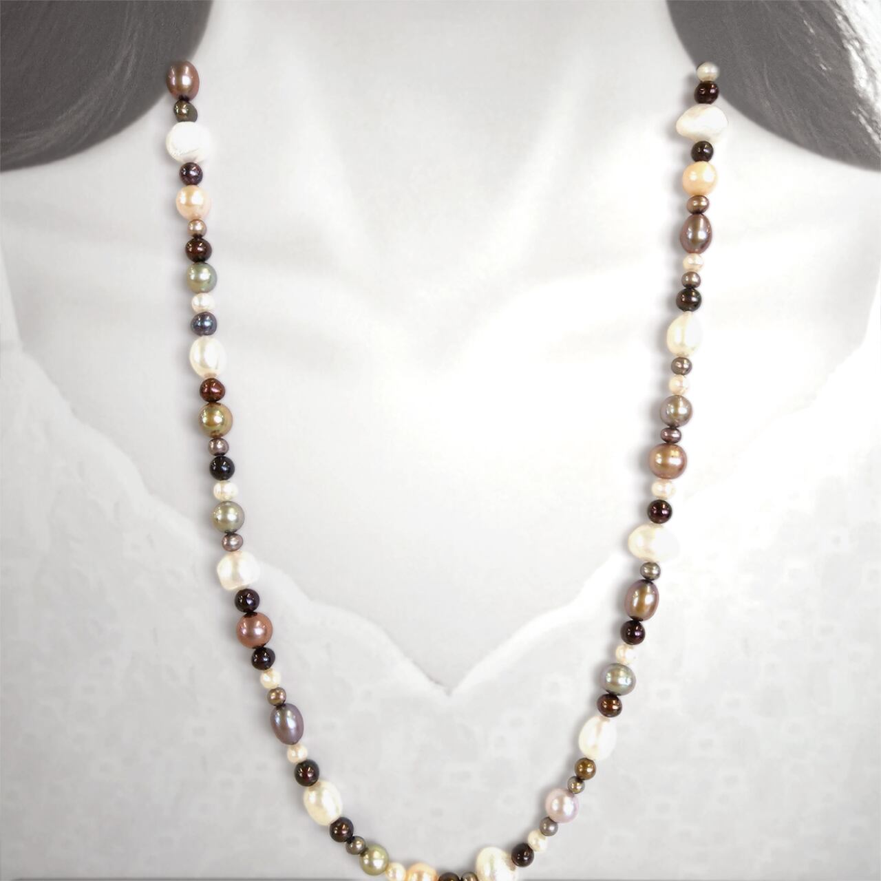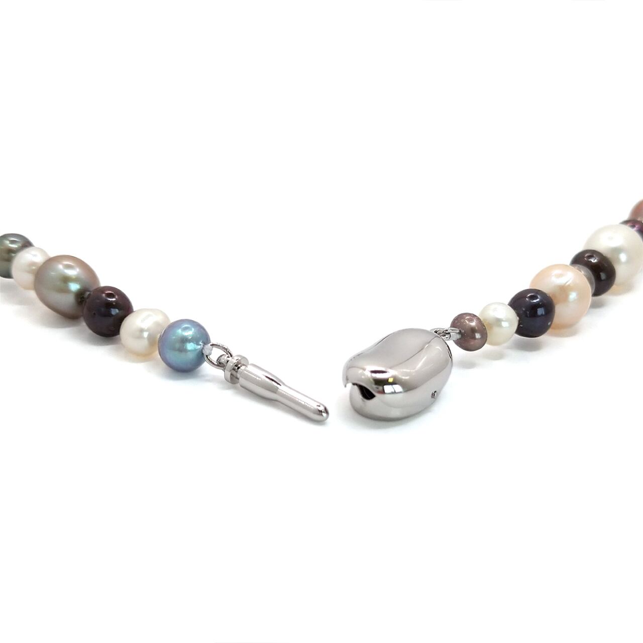 変形バロックの白い淡水パールをポイントに、小さめのマルチカラーパールを繋いだロングネックレス。最大幅約10mmは、存在感がありつつスマートに着用できる絶妙なサイズ。ペールオレンジ、グリーン、ブラウン、パープルと淡いトーンの多色使いは、洋服の色を選ばずコーディネートしやすいのも高ポイントです。バストトップより少し上の60cmは、かがんだ時にも机などにあたらず、かちゃかちゃとぶつかる心配のない長さにこだわりました。着脱は、表裏/前後がなく向きを気にせずに差し込むだけのワンタッチクラスプで使いやすさもGOOD☆